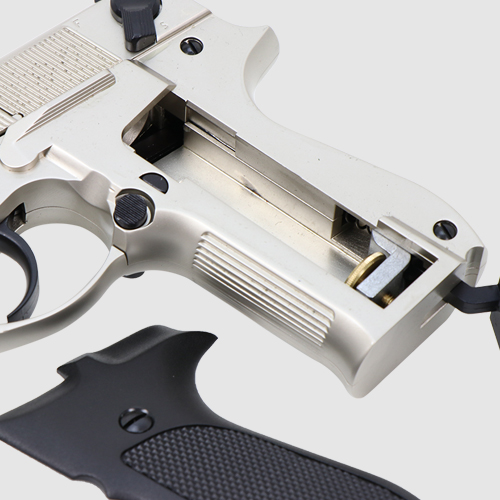 The firing mechanism, which relies on an 8-round rotary magazine, is optimized for high performance. Unlike the mechanism in many other pistols, it is located in the two-part slide behind the barrel instead of in the frame. This ensures that pellets are fed precisely into the rifled barrel. Power is supplied by a 12 g CO₂ cartridge.
