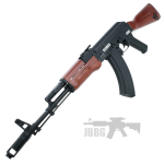 This is the Kalashnikov AK74 CO2 Powered Air Rifle by Cybergun. This outstanding gun is a replica of the assault rifle developed in the Soviet Union by Mikhail Kalashnikov in the 1940s. This Official Licensed Replica of the Russian AK74 Kalashnikov looks and feels just like the real thing. The stock and foregrip are real wood and the receiver is full metal. The action and barrel are also metal and this is a semi-automatic airgun that takes 4.5 steel BBs. The magazine is also full metal and is a 2 part design powered by one 12 gram CO2 cartridge. The magazine holds 18 rounds of 4.5 BBs and the gun fires a good FPS of 514 in a semi-auto mode. Please note that this replica rifle is not intended for use in hunting live quarry or for pest control purposes. However, it is great as a collector’s gun or for non-competition target shooting.