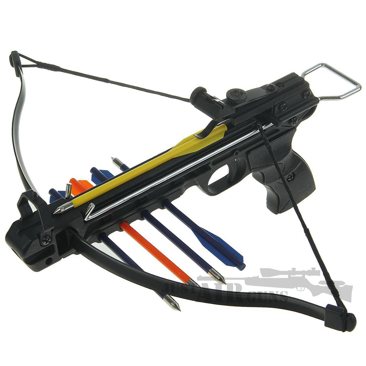 This is the Man Kung MK-50A2/5PL recurve pistol crossbow, don’t be fooled by its size – this crossbow really packs a punch. It is constructed of durable plastic and comes with 5 high-quality bolts with an inbuilt quiver. 6.5-inch bolts are recommended for replacements.