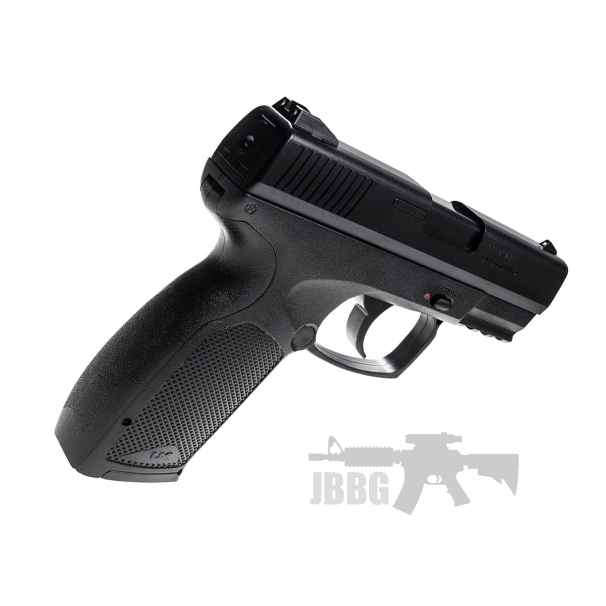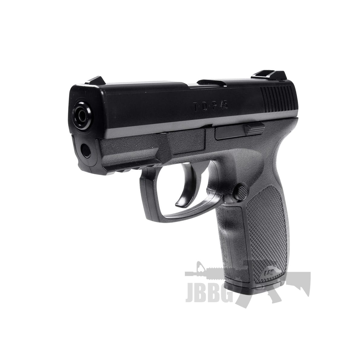 This is the Umarex T.D.P. 45 air pistol now at just air guns UK. Start enjoying shooting again… with this inexpensive Co2 pistol from Umarex. Powered by a 12g Co2 Capsule and fires 4.5 steel BBs at a good FPS. The accuracy is good and a joy to fire due to the 2 stage trigger and semi-auto firing. A good quality ABS air pistol with easy co2 loading and 410 FPS using 4.5 steel BBs. The metal mag holds 19 rounds and the pistol has a fixed top slide with no blowback to increase the FPS. On top, it has a fixed blade and notch sights. It also has a double action trigger a manual safety and a tactical bottom rail system. The pistol is powered with 12-gram Co2 cartridges and will outperform most replica pistols at this price.